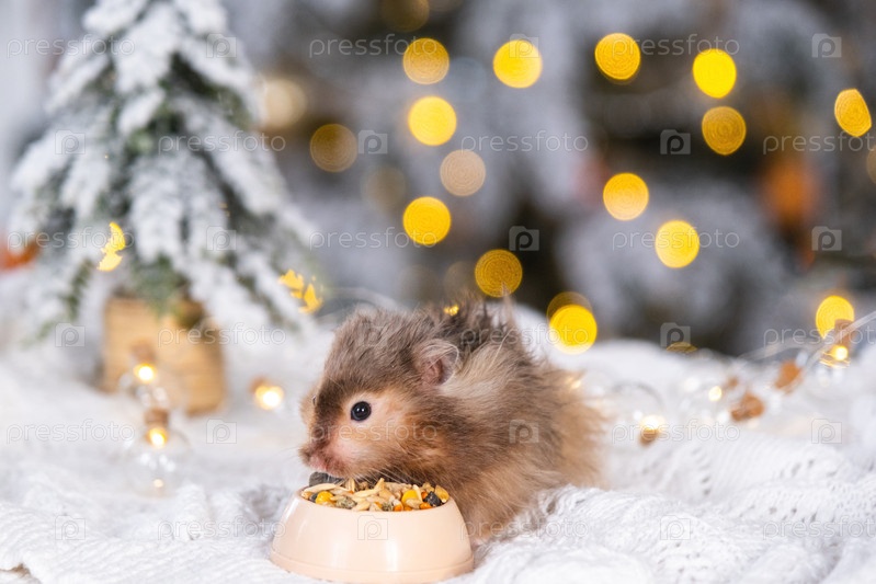 Забавный лохматый пушистый хомяк грызет семена из чаши на рождественском фоне с волшебными огнями и боке