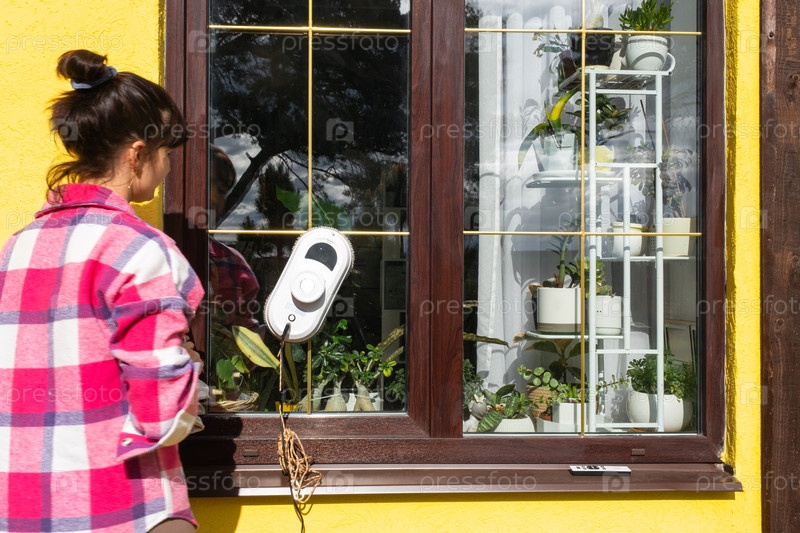 Женщина запускает робота-уборщика окон дома снаружи с желтым фасадом. Домашняя робототехника, домашний помощник, уборка сервиза
