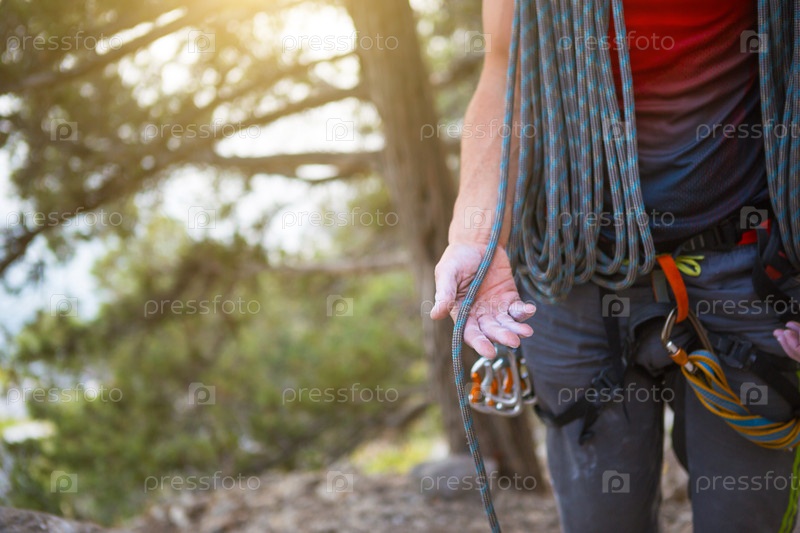 Мужской альпинист кавказской внешности с свернутой веревкой в руке. Веревочная обмотка, узел, склад оборудования. Рука в белой магнезии. Красный спорт Джерси, экстремальные виды спорта, скалолазание. Стиль жизни