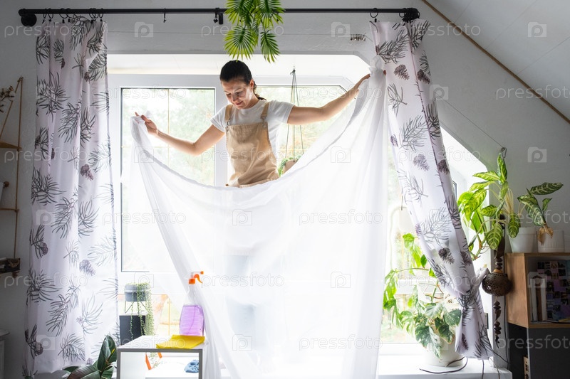 Женщина в фартуке вешает прозрачные тюльские шторы на большие чердачные окна в доме внутри интерьера с горшечными растениями. Весенняя уборка, уборка