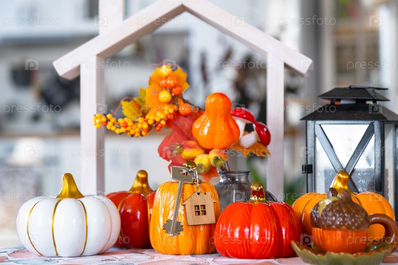 Уютный осенний декор на белой кухне с крошечным домом и ключами, тыквами, осенними листьями, осенним настроением, Хэллоуином, Праздником урожая, жильем, переселением, ипотекой, страховкой