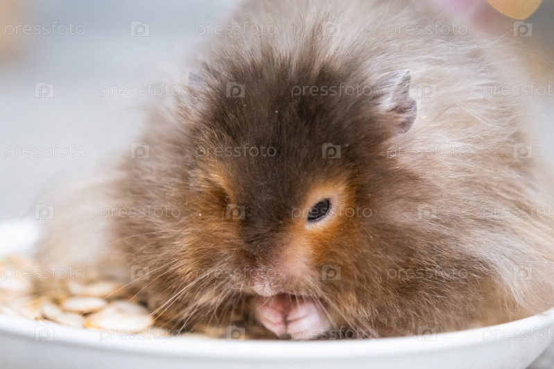 Забавный лохматый пушистый хомяк, сидящий в тарелке И ест семена на рождественском фоне с волшебными огнями и боке