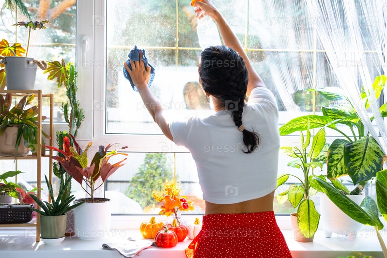 Женщина вручную моет окно дома тряпкой и шваброй внутри интерьера с домашними растениями на подоконнике и тыквенным декором. Восстановление порядка и чистоты осенью, уборка сервиза