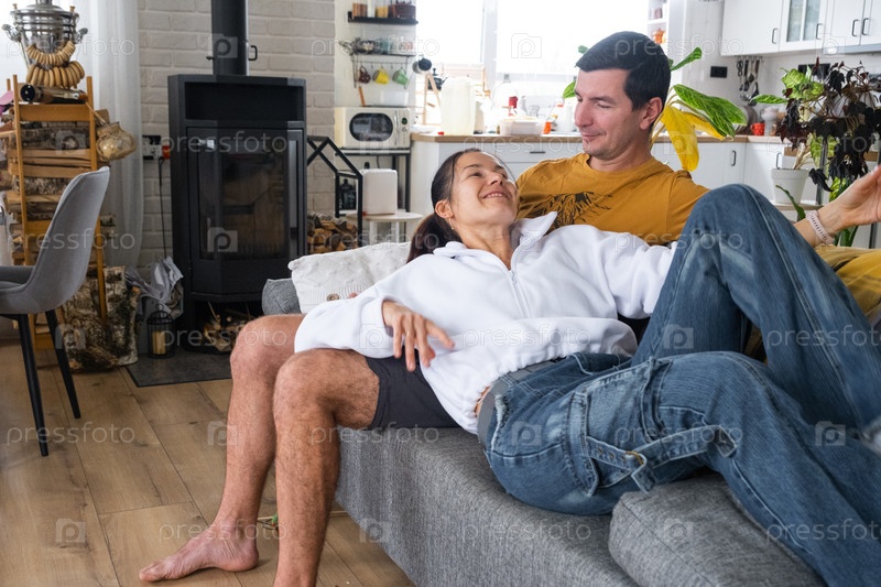Мужчина и женщина счастливые дома в белом интерьере сидят на диване. Домашний отдых, досуг, любовь, семья, дата