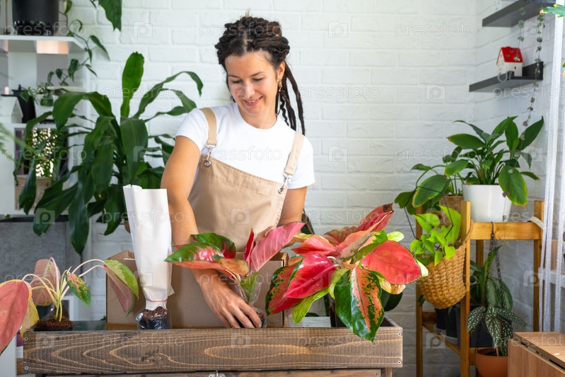 Женщина распаковывает коробку с посылкой горшечных цветов красного аглаонема - заказ завернутых тропических растений, доставка. Продажа, безопасная отправка растений из магазина, упаковка. Цветочный магазин, домашний бизнес