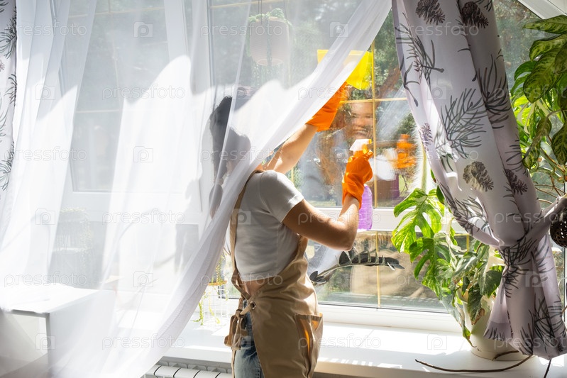 Женщина в резиновых перчатках и фартуке вручную моет окно дома тряпкой и шваброй внутри интерьера с домашними растениями на подоконнике. Восстановление порядка и чистоты весной, уборка сервиза