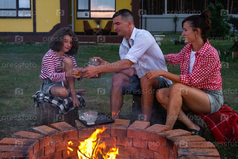 Семья мамы, папы, дочери пьют чай во дворе дома у пожарной ямы уютным летним вечером