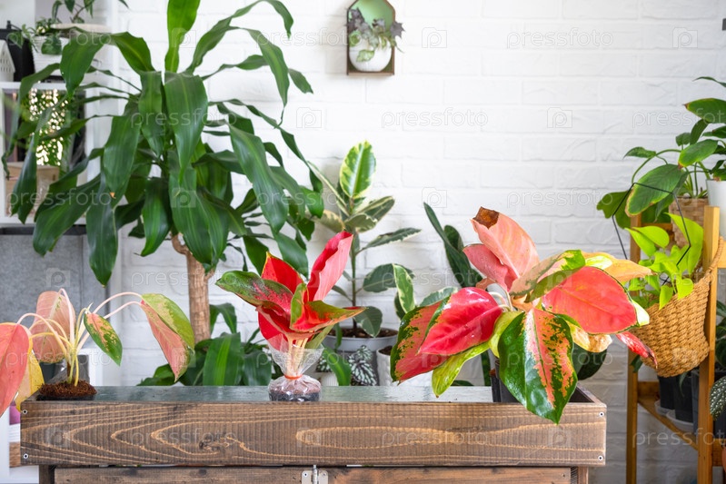 Различные сорта тропических аглаонем на цветочном столе в интерьере дома. Цветочное хобби селекционера горшечных растений