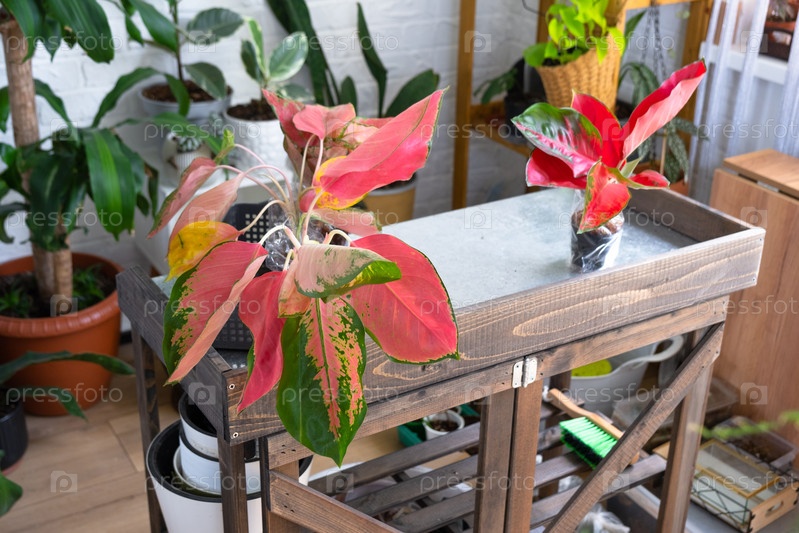 Различные сорта тропических аглаонем на цветочном столе в интерьере дома. Цветочное хобби селекционера горшечных растений