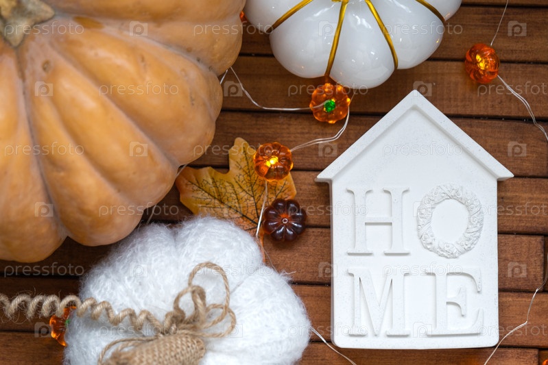 Уютная планировка на деревянном фоне планок с тыквами, осенними листьями, домом и ключами - осеннее настроение, Хэллоуин, жилье, переселение, ипотека, страхование