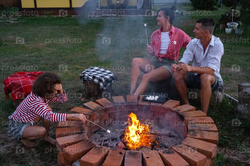 Семья мама, папа, дочь жарят зефир на шашлыках на костре в очаге во дворе дома у пожарной ямы уютным летним вечером