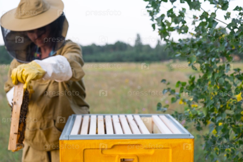 Пчеловод, женщина в защитном костюме от укусов пчел, держит в руках раму с медом из пчелиного улья. Пчеловодство, уход за ульем