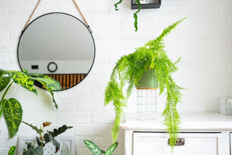 Пышный папоротник в белом лофт-стиле интерьера. Нефролепис Мариса - разнообразный декоративный папоротник