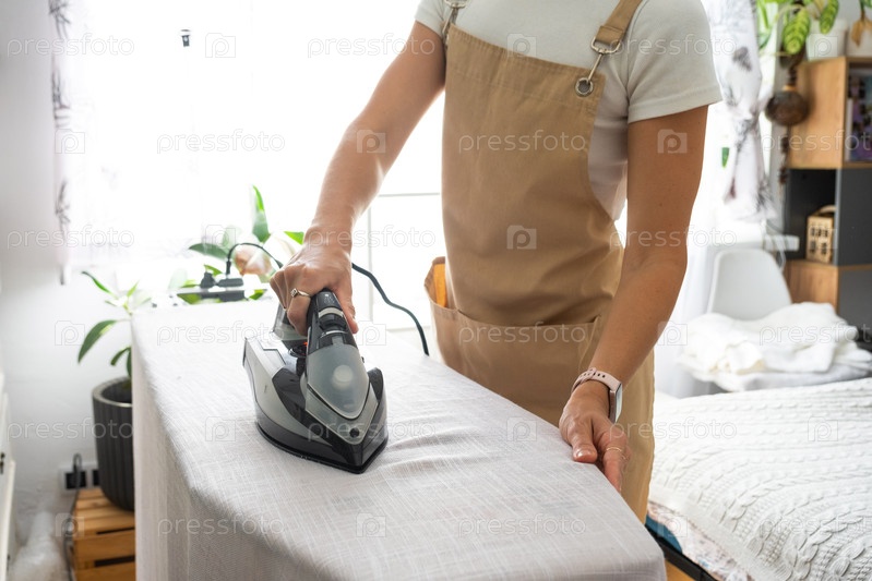 Домохозяйка женщины в фартуке утюги льняные шторы в комнате на гладильной доске