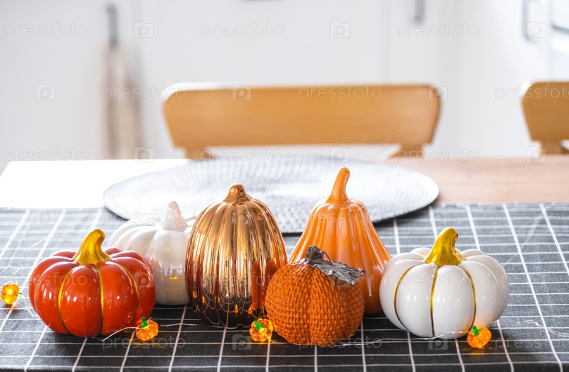Декор белой классической кухни с тыквами, гирляндами, поздней для Хэллоуина и урожая с фигуркой дома. Осеннее настроение в домашнем интерьере, современный стиль лофта. недвижимость, страхование, ипотека