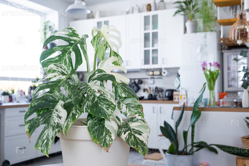 Монстрия Альба является редким разноцветным крупным планом в интерьере на стенде. Выращивание комнатных растений и уход за комнатным растением, зеленый дом
