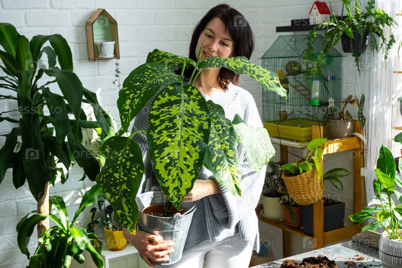 Пересадка и уход за домашним растением dieffenbachia Cheetah в новый горшок в домашнем интерьере. Женщина разводит и выращивает растения как хобби, держит вариетальную диффенбахию с большими пятнистыми листьями, больших размеров