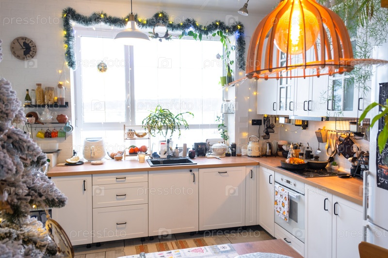 Рождественский декор в белой кухне, современный деревенский интерьер со снежной елкой и золотыми сказочными огнями. Новый год, рождественское настроение, уютный дом