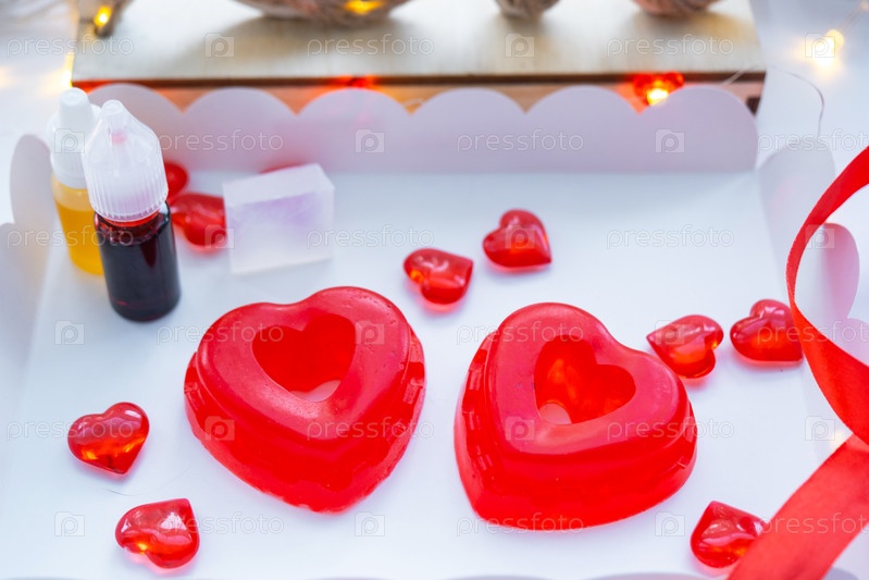 Домашнее мыло ручной работы в форме сердца для подарка на День святого Валентина любимой. Парфюмерия и красители, мыльная основа на столе