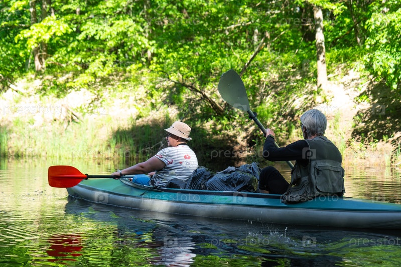 Семейная поездка на байдарках для сеньора и сеньоры. Пожилая супружеская пара гребля на лодке по реке, поход по воде, летнее приключение. Возрастные виды спорта, умственная молодость и здоровье, туризм, активная старость