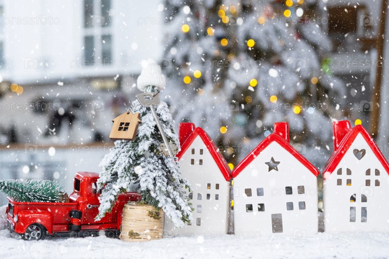 Ключ на елке и крошечный домик с красной крышей с рождественским декором в красном ретро-автомобиле на столе. Подарок на Новый год. Страхование, переезд в новый дом, ипотека, аренда и недвижимость