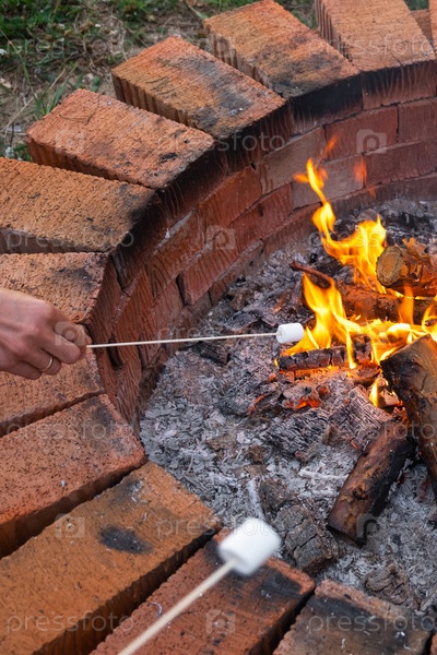 Маршаллоу на шатре жарят над костром в круглой кирпичной яме с горящей древесиной