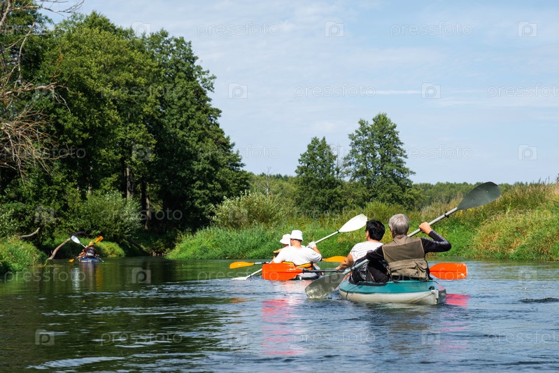 Групповая поездка на байдарках для сеньора и сеньоры. Пожилая пара и взрослая гребная лодка на реке, поход по воде, летнее приключение. Возрастные виды спорта, умственная молодость и здоровье, туризм, активная старость