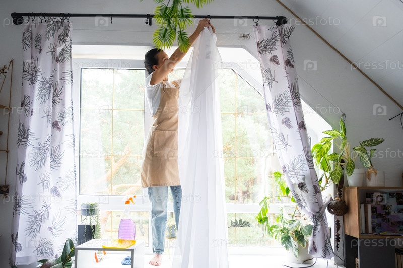 Женщина в фартуке вешает прозрачные тюльские шторы на большие чердачные окна в доме внутри интерьера с горшечными растениями. Весенняя уборка, уборка