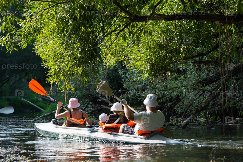 Семья с детьми на рафтинге в групповом каяк-путешествии разного возраста, взрослых, пожилых людей. Гребная лодка на реке, водный поход, летние приключения