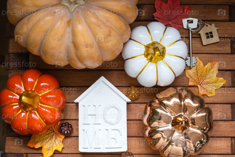 Уютная планировка на деревянном фоне планок с тыквами, осенними листьями, домом и ключами - осеннее настроение, Хэллоуин, жилье, переселение, ипотека, страхование
