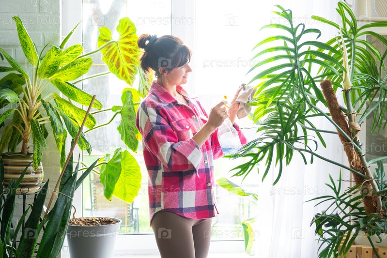 Женщина вручную моет окно дома тряпкой и шваброй внутри интерьера с домашними растениями. Восстановление порядка и чистоты весной, уборка сервиза