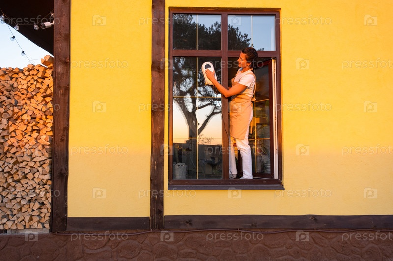 Женщина запускает робота-уборщика окон дома снаружи с желтым фасадом. Домашняя робототехника, домашний помощник, уборка сервиза