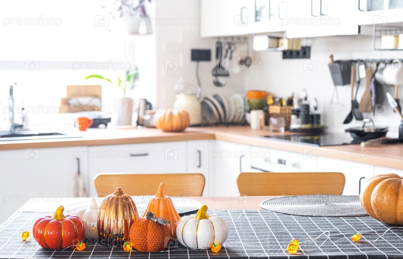 Декор белой классической кухни с тыквами, гирляндами, поздней для Хэллоуина и урожая с фигуркой дома. Осеннее настроение в домашнем интерьере, современный стиль лофта. недвижимость, страхование, ипотека