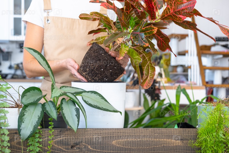 Пересадка и уход за домашним растением кодиевого кротона в новый горшок в домашнем интерьере. Женщина разводит и выращивает растения хобби, держит тропическое растение с красными листьями