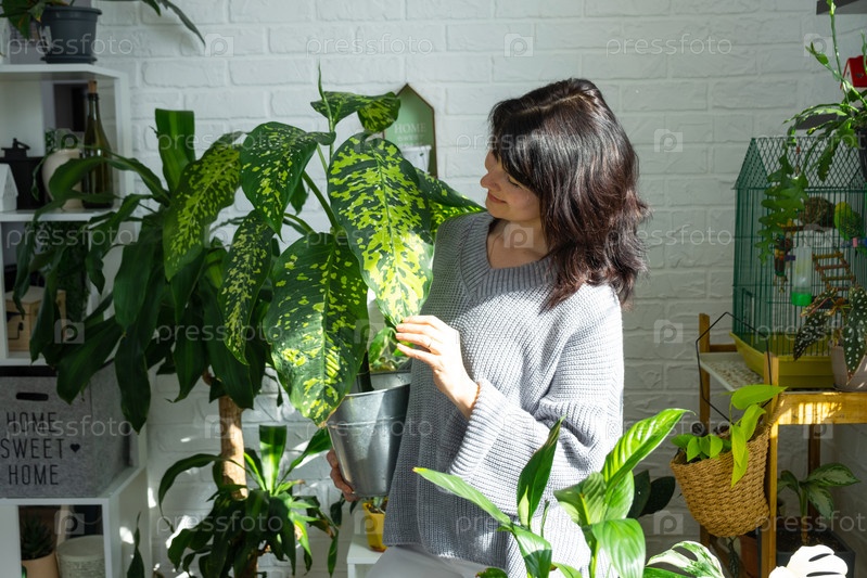 Пересадка и уход за домашним растением dieffenbachia Cheetah в новый горшок в домашнем интерьере. Женщина разводит и выращивает растения как хобби, держит вариетальную диффенбахию с большими пятнистыми листьями, больших размеров
