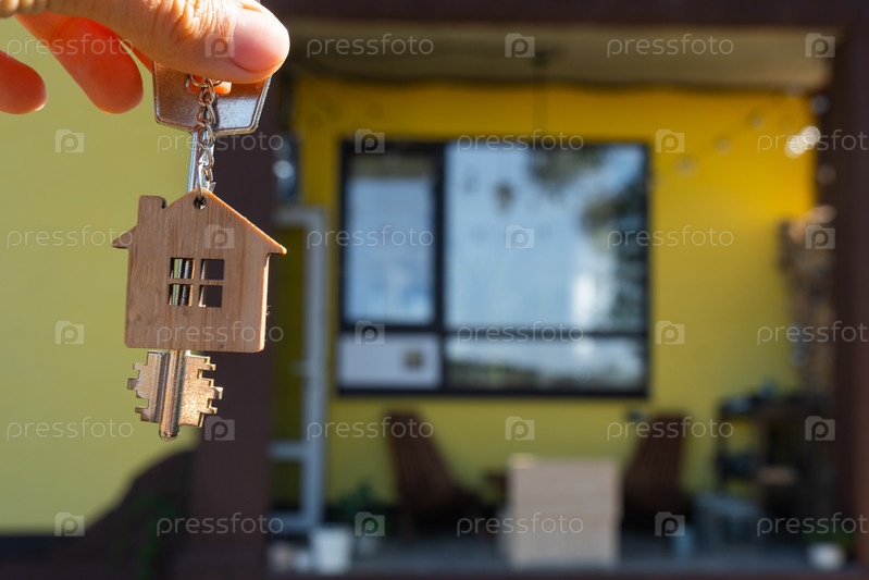 Ключ к дому с крошечным домом в руках владельца рядом с коттеджем - продажа, переезд, бронирование, проект коттеджа, ипотека, страхование жилья и недвижимости
