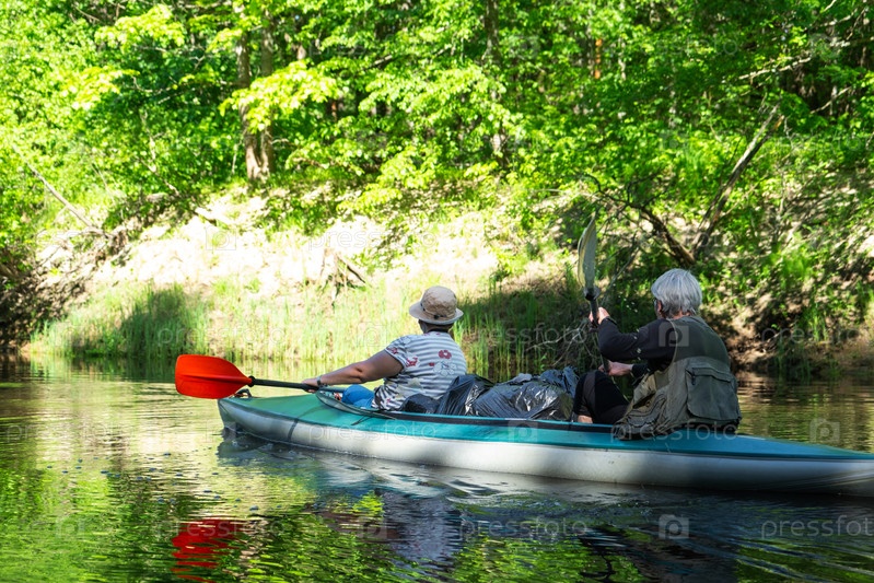 Семейная поездка на байдарках для сеньора и сеньоры. Пожилая супружеская пара гребля на лодке по реке, поход по воде, летнее приключение. Возрастные виды спорта, умственная молодость и здоровье, туризм, активная старость