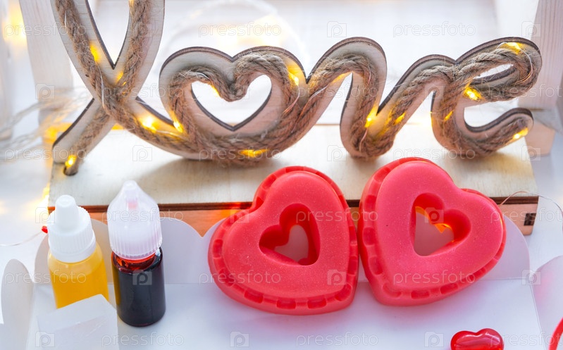 Домашнее мыло ручной работы в форме сердца для подарка на День святого Валентина любимой. Парфюмерия и красители, мыльная основа на столе