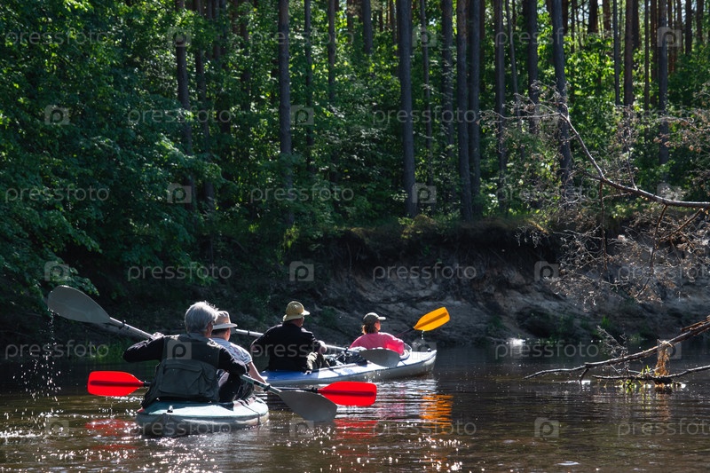 Групповая поездка на байдарках для сеньора и сеньоры. Пожилая пара и взрослая гребная лодка на реке, поход по воде, летнее приключение. Возрастные виды спорта, умственная молодость и здоровье, туризм, активная старость