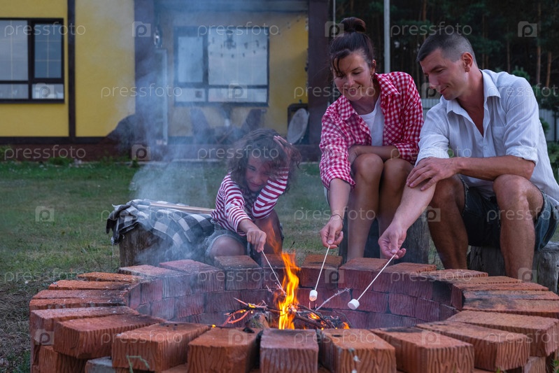 Семья мама, папа, дочь жарят зефир на шашлыках на костре в очаге во дворе дома у пожарной ямы уютным летним вечером