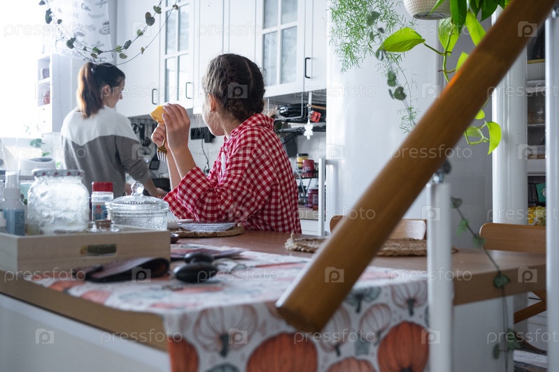 Девушка завтракает на кухне утром за столом в компании матери, утренние приготовления