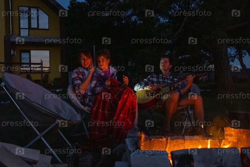 Семья сидит у костра, мужчина играет на гитаре, женщина слушает и поет, дочь завернулась в одеяло. Семейный летний вечер во дворе дома