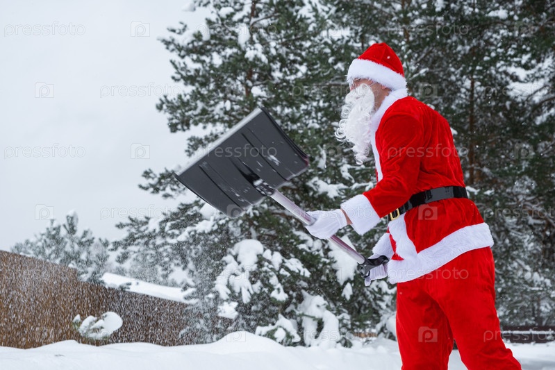 Санта-Клаус очищает снег лопатой зимой на открытом воздухе после снегопада. Уборка улиц в поселке, расчистка проезда для автомобилей, сложные погодные условия на Рождество и Новый год