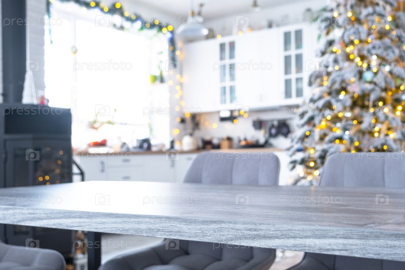 Серый деревянный пустой стол, чтобы продемонстрировать продукт с пространством для текста с обитыми стульями на белой кухне, современным интерьером с рождественской елкой и сказочными огнями. Новый год, рождественское настроение, уютный дом