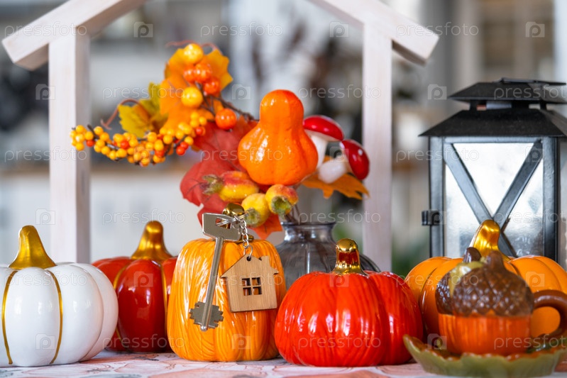 Уютный осенний декор на белой кухне с крошечным домом и ключами, тыквами, осенними листьями, осенним настроением, Хэллоуином, Праздником урожая, жильем, переселением, ипотекой, страховкой