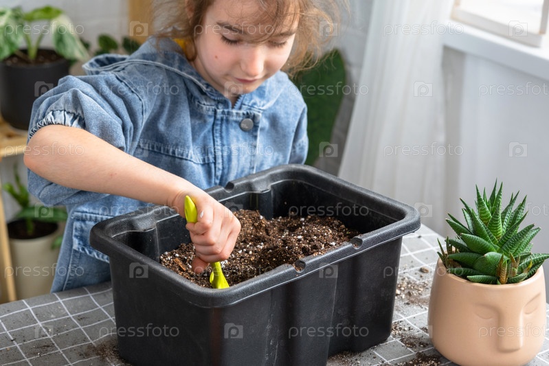 Хобби девушки - пересадка доморощенных горшечных растений, девушка перемешивает почву