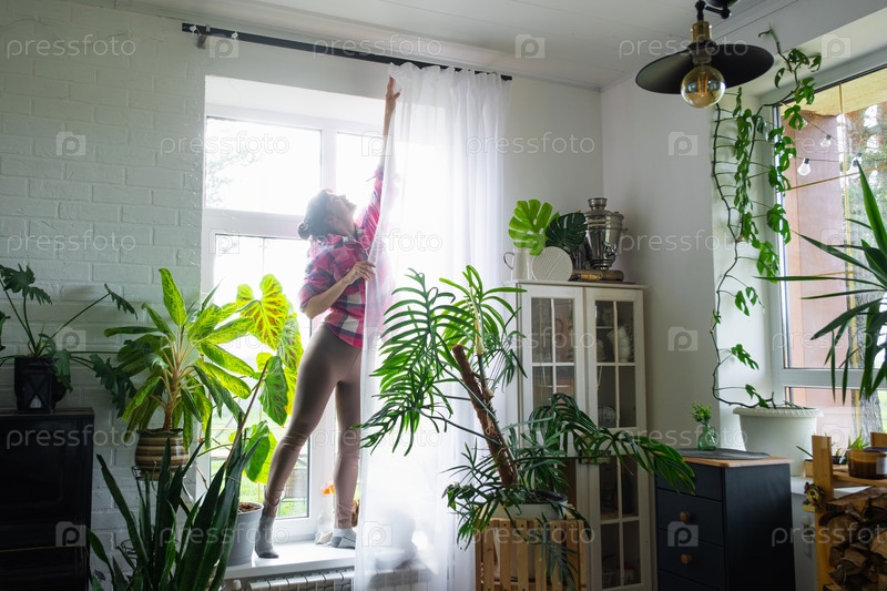Женщина вешает прозрачные тюльские шторы на большие окна в доме внутри интерьера. Весенняя уборка, уборка