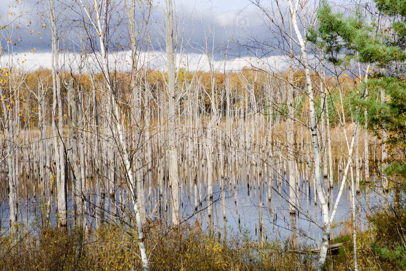 Болото с сухими мертвыми деревьями, бревнами и цветущими хвостами. Экологические проблемы, заболачивание территории, необитаемые районы. Естественный фон