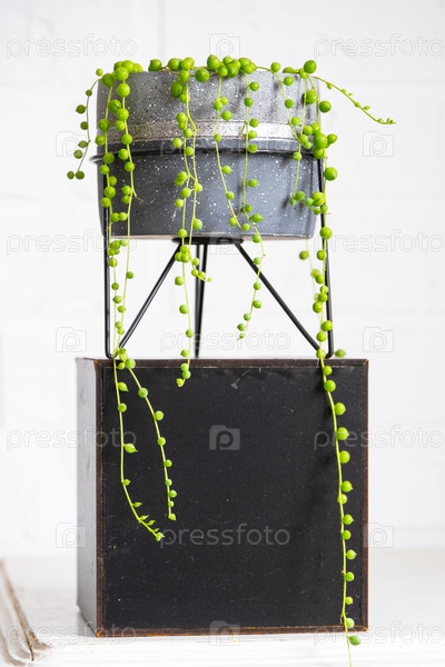 Длинные ресницы суккулента Senecio rowleyanus в бетонном горшке висят с круглыми черепаховыми листьями. Senecio rowley крупный план в интерьере на белом фоне, декоративное растение