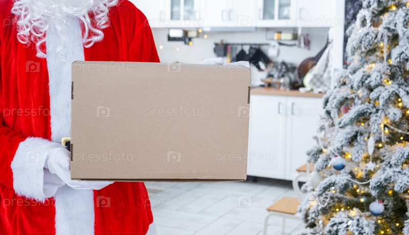 Курьер одет как Санта с коробкой на кухне с белыми рождественскими украшениями и рождественской елкой. Доставка подарков на Новый год и Рождество, курьерская служба